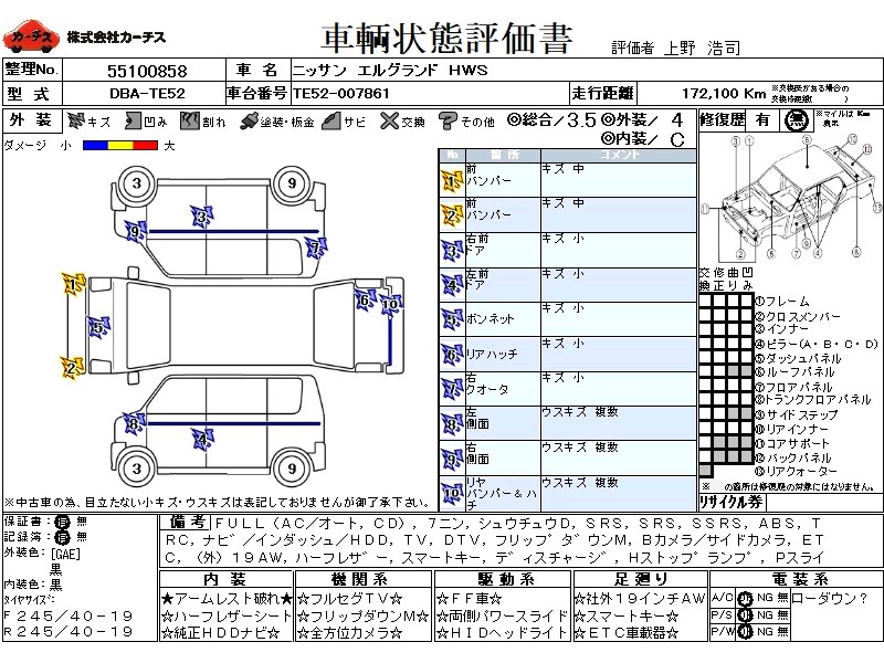 フル装備 / CD / 乗車定員(7人) / 集中ドアロック / エアバッグ / 助手席エアバッグ / サイドエアバッグ / ABS / トラクションコントロール / カーナビゲーション(インダッシュ,HDD) / テレビ(アナログ) / 地デジTV / フリップダウンモニタ / バックカメラ(サイドカメラ) / ETC / アルミホイール(社外)(19インチ) / ハーフレザーシート / スマートキー / ディスチャージ / ハイマウントストップランプ / パワースライドドア / フォグランプ / フロントスポイラー / サイドスポイラー / リアスポイラー /