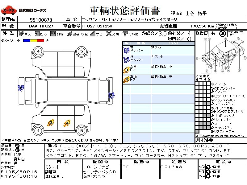フル装備 / CD / 乗車定員(7人) / 集中ドアロック / エアバッグ / 助手席エアバッグ / サイドエアバッグ / ABS / トラクションコントロール / クルーズコントロール / カーナビゲーション(インダッシュ,SSD,2DIN) / テレビ(アナログ) / 地デジTV / フリップダウンモニタ / バックカメラ(フロント) / ETC / アルミホイール(16インチ) / スマートキー / ウインカーミラー / ハイマウントストップランプ / パワースライドドア / フォグランプ / フロントスポイラー / サイドスポイラー / リアスポイラー /