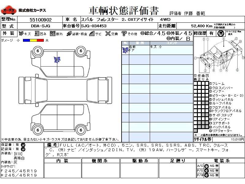 フル装備 / CD(社外) / 乗車定員(5人) / エアバッグ / 助手席エアバッグ / サイドエアバッグ / ABS / トラクションコントロール / クルーズコントロール / カーナビゲーション(社外)(インダッシュ,2DIN) / テレビ(アナログ) / ETC(社外) / アルミホイール(社外)(19インチ) / ハーフレザーシート / スマートキー / フォグランプ / リアスポイラー /