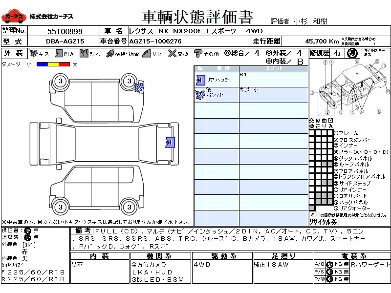 フル装備 / CD / マルチ(ナビ) / エアコン(オート) / テレビ(アナログ) / 乗車定員(5人) / エアバッグ / 助手席エアバッグ / サイドエアバッグ / ABS / トラクションコントロール / クルーズコントロール / バックカメラ / アルミホイール(18インチ) / 革シート(黒) / スマートキー / パワーバックドア / フォグランプ / リアスポイラー /