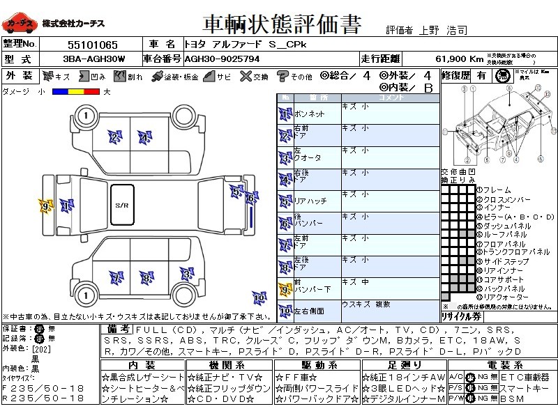 フル装備 / CD / マルチ(ナビ) / エアコン(オート) / テレビ(アナログ) / 乗車定員(7人) / エアバッグ / 助手席エアバッグ / サイドエアバッグ / ABS / トラクションコントロール / クルーズコントロール / フリップダウンモニタ / バックカメラ / ETC / アルミホイール(18インチ) / サンルーフ / 革シート(その他) / スマートキー / パワースライドドア / パワーバックドア / フォグランプ / リアスポイラー /