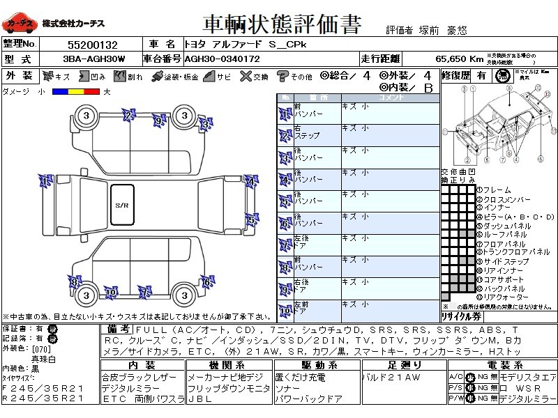 フル装備 / CD / 乗車定員(7人) / 集中ドアロック / エアバッグ / 助手席エアバッグ / サイドエアバッグ / ABS / トラクションコントロール / クルーズコントロール / カーナビゲーション(インダッシュ,SSD,2DIN) / テレビ(アナログ) / 地デジTV / フリップダウンモニタ / バックカメラ(サイドカメラ) / ETC / アルミホイール(社外)(21インチ) / サンルーフ / 革シート(黒) / スマートキー / ウインカーミラー / ハイマウントストップランプ / パワースライドドア / パワーバックドア / フォグランプ / フロントスポイラー / サイドスポイラー / リアスポイラー / リアアンダースポイラー /