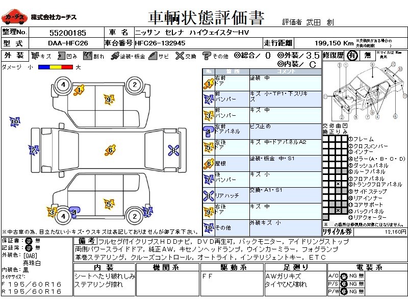 フル装備 / CD / 乗車定員(8人) / エアバッグ / 助手席エアバッグ / ABS / クルーズコントロール / カーナビゲーション(社外)(HDD) / テレビ(社外) / 地デジTV(社外) / ETC(社外) / アルミホイール(16インチ) / スマートキー / ディスチャージ / ウインカーミラー / ハイマウントストップランプ / パワースライドドア / フォグランプ / サイドスポイラー /