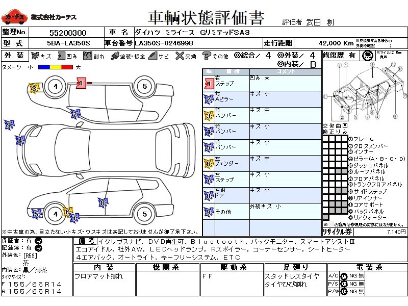 フル装備 / CD(社外) / 乗車定員(4人) / エアバッグ / 助手席エアバッグ / サイドエアバッグ / ABS / カーナビゲーション(社外)(SSD) / ETC(社外) / アルミホイール(社外)(14インチ) / スマートキー / ハイマウントストップランプ / リアスポイラー /