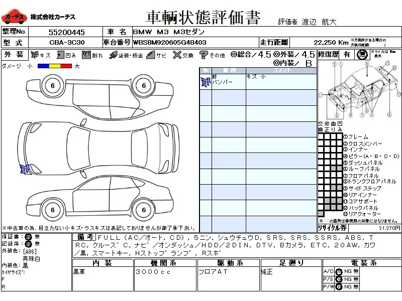 フル装備 / CD / 乗車定員(5人) / 集中ドアロック / エアバッグ / 助手席エアバッグ / サイドエアバッグ / ABS / トラクションコントロール / クルーズコントロール / カーナビゲーション(オンダッシュ,HDD,2DIN) / 地デジTV / バックカメラ / ETC / アルミホイール(20インチ) / 革シート(黒) / スマートキー / ハイマウントストップランプ / リアスポイラー /