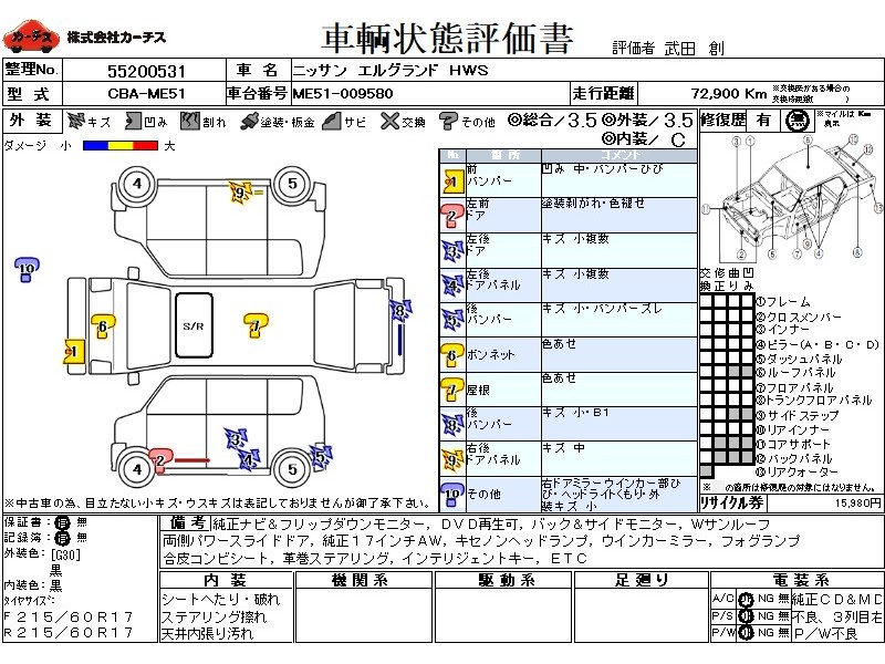 乗車定員(8人) / エアコン(オート) / パワーステアリング / パワーウィンドウ / エアバッグ / 助手席エアバッグ / ABS / カーナビゲーション(DVD) / フリップダウンモニタ / バックカメラ(サイドカメラ) / ETC / アルミホイール(17インチ) / ダブルサンルーフ / スマートキー / ディスチャージ / ウインカーミラー / ハイマウントストップランプ / パワースライドドア / フォグランプ / サイドスポイラー / リアスポイラー /