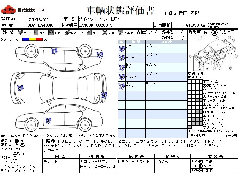 フル装備 / CD(社外) / 乗車定員(2人) / 集中ドアロック / エアバッグ / 助手席エアバッグ / ABS / トラクションコントロール / カーナビゲーション(社外)(インダッシュ,SSD,2DIN) / テレビ(社外) / 地デジTV(社外) / ETC(社外) / アルミホイール(16インチ) / スマートキー / ハイマウントストップランプ / フォグランプ / フロントスポイラー(社外) / リアスポイラー(社外) /