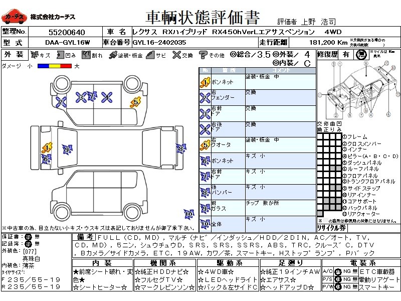 フル装備 / CD / MD / マルチ(ナビ) / エアコン(オート) / テレビ(アナログ) / 乗車定員(5人) / 集中ドアロック / エアバッグ / 助手席エアバッグ / サイドエアバッグ / ABS / トラクションコントロール / クルーズコントロール / 地デジTV / バックカメラ(サイドカメラ) / ETC / アルミホイール(19インチ) / 革シート(茶) / スマートキー / ハイマウントストップランプ / パワーバックドア / フォグランプ / ルーフレール / フロントスポイラー(社外) / リアスポイラー / リアアンダースポイラー(社外) /