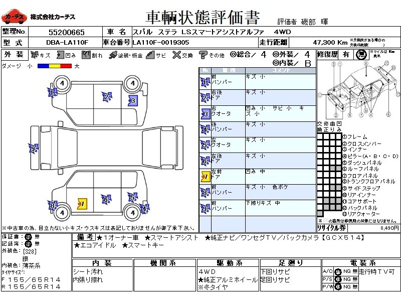 フル装備 / CD / 乗車定員(4人) / 集中ドアロック / エアバッグ / 助手席エアバッグ / ABS / トラクションコントロール / カーナビゲーション(インダッシュ,SSD,2DIN) / テレビ(アナログ) / バックカメラ / アルミホイール(14インチ) / スマートキー / ハイマウントストップランプ /