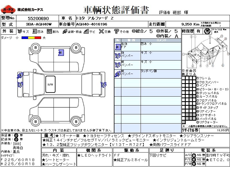 乗車定員(7人) / エアコン(オート) / パワーステアリング / パワーウィンドウ / 集中ドアロック / エアバッグ / 助手席エアバッグ / サイドエアバッグ / ABS / トラクションコントロール / クルーズコントロール / カーナビゲーション(インダッシュ,SSD,2DIN) / 地デジTV / フリップダウンモニタ / バックカメラ(サイドカメラ) / ETC / アルミホイール(18インチ) / ハーフレザーシート / スマートキー / ウインカーミラー / ハイマウントストップランプ / パワースライドドア / パワーバックドア / フォグランプ / リアスポイラー /