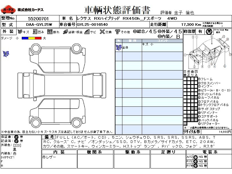 フル装備 / CD / 乗車定員(5人) / 集中ドアロック / エアバッグ / 助手席エアバッグ / サイドエアバッグ / ABS / トラクションコントロール / クルーズコントロール / カーナビゲーション(オンダッシュ,SSD) / 地デジTV / バックカメラ(サイドカメラ) / ETC / アルミホイール(20インチ) / 革シート(その他) / スマートキー / ウインカーミラー / ハイマウントストップランプ / パワーバックドア / フォグランプ / フロントスポイラー(社外) / サイドスポイラー(社外) / リアスポイラー / リアアンダースポイラー(社外) / マフラー(社外) /
