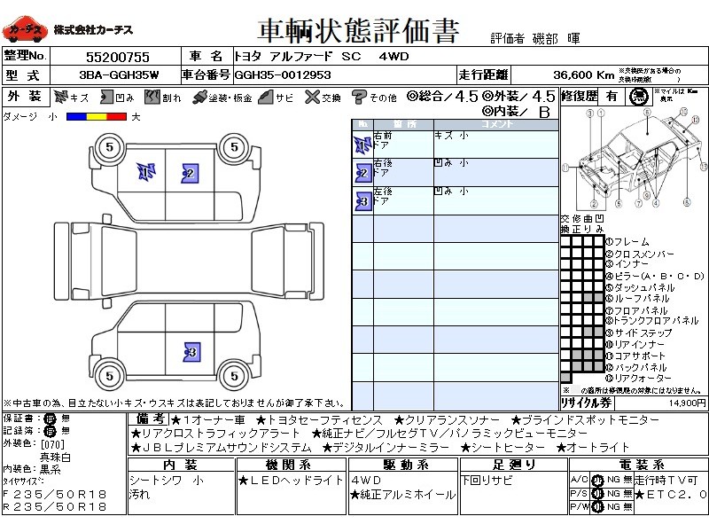 フル装備 / CD / 乗車定員(7人) / 集中ドアロック / エアバッグ / 助手席エアバッグ / サイドエアバッグ / ABS / トラクションコントロール / クルーズコントロール / カーナビゲーション(インダッシュ,SSD,2DIN) / 地デジTV / フリップダウンモニタ / バックカメラ(サイドカメラ) / ETC / アルミホイール(18インチ) / 革シート(黒) / スマートキー / ウインカーミラー / ハイマウントストップランプ / パワースライドドア / パワーバックドア / フォグランプ /