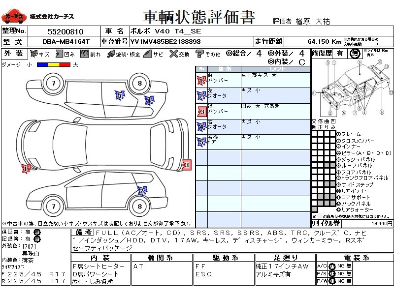 フル装備 / CD / エアバッグ / 助手席エアバッグ / サイドエアバッグ / ABS / トラクションコントロール / クルーズコントロール / カーナビゲーション(インダッシュ,HDD) / 地デジTV / ETC(社外) / アルミホイール(17インチ) / キーレスエントリー / ディスチャージ / ウインカーミラー / リアスポイラー /