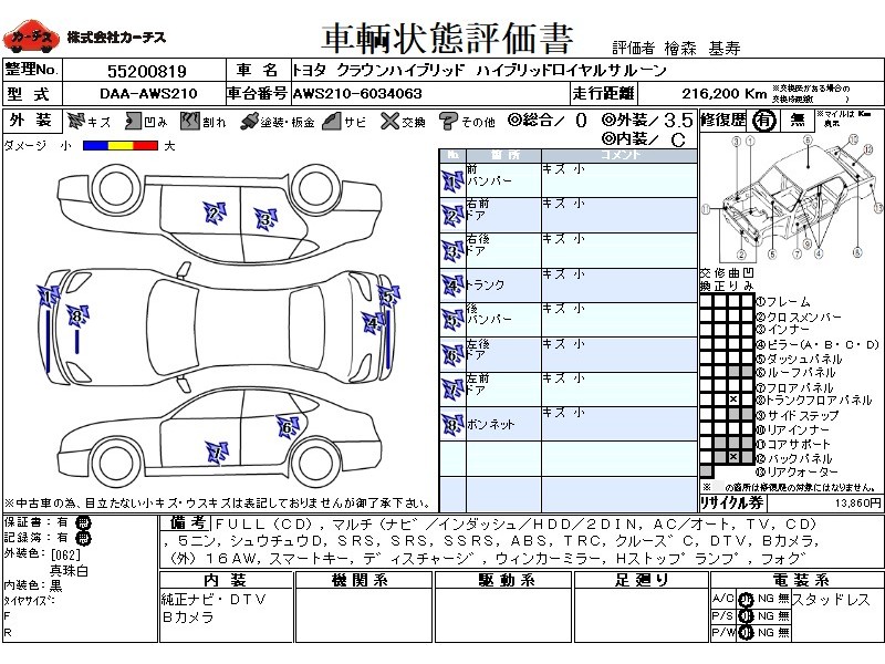 フル装備 / CD / マルチ(ナビ) / エアコン(オート) / テレビ(アナログ) / 乗車定員(5人) / 集中ドアロック / エアバッグ / 助手席エアバッグ / サイドエアバッグ / ABS / トラクションコントロール / クルーズコントロール / 地デジTV / バックカメラ / アルミホイール(社外)(16インチ) / スマートキー / ディスチャージ / ウインカーミラー / ハイマウントストップランプ / フォグランプ /