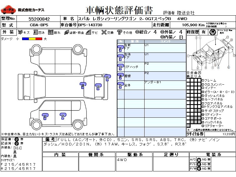フル装備 / CD(社外) / 乗車定員(5人) / エアバッグ / 助手席エアバッグ / ABS / トラクションコントロール / カーナビゲーション(社外)(インダッシュ,HDD,2DIN) / 地デジTV(社外) / ETC(社外) / アルミホイール(社外)(17インチ) / キーレスエントリー / フォグランプ / サイドスポイラー / リアスポイラー /