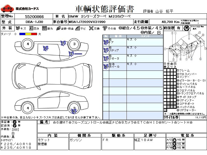 フル装備 / CD / 乗車定員(4人) / 集中ドアロック / エアバッグ / 助手席エアバッグ / サイドエアバッグ / ABS / トラクションコントロール / クルーズコントロール / カーナビゲーション(オンダッシュ,HDD) / バックカメラ / ETC / アルミホイール(18インチ) / スマートキー / ディスチャージ / ハイマウントストップランプ / リアスポイラー /