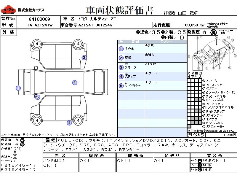 フル装備 / CD / マルチ(ナビ) / エアコン(オート) / 乗車定員(5人) / 集中ドアロック / エアバッグ / 助手席エアバッグ / ABS / トラクションコントロール / バックカメラ / ETC(社外) / アルミホイール(17インチ) / キーレスエントリー / ディスチャージ / フォグランプ / フロントスポイラー / サイドスポイラー / リアスポイラー / リアアンダースポイラー /