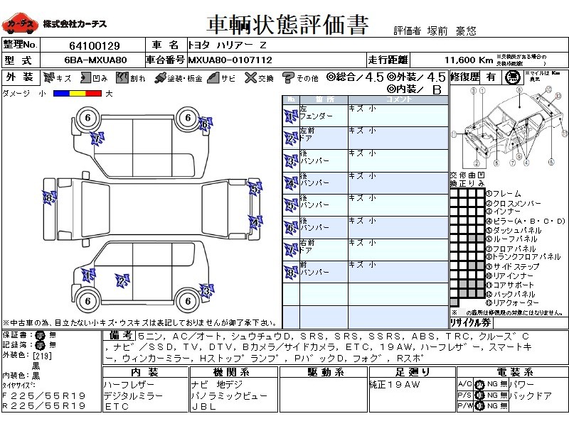 乗車定員(5人) / エアコン(オート) / パワーステアリング / パワーウィンドウ / 集中ドアロック / エアバッグ / 助手席エアバッグ / サイドエアバッグ / ABS / トラクションコントロール / クルーズコントロール / カーナビゲーション(SSD) / テレビ(アナログ) / 地デジTV / バックカメラ(サイドカメラ) / ETC / アルミホイール(19インチ) / ハーフレザーシート / スマートキー / ウインカーミラー / ハイマウントストップランプ / パワーバックドア / フォグランプ / リアスポイラー /