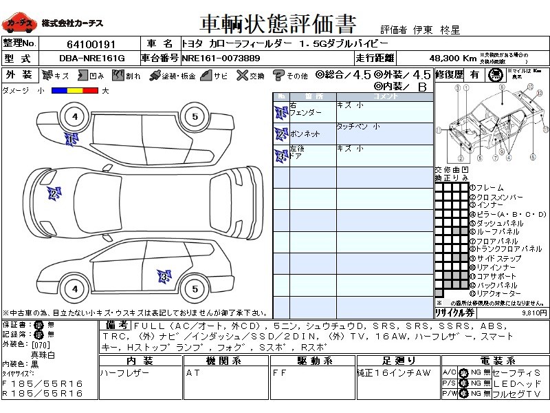 フル装備 / CD(社外) / 乗車定員(5人) / 集中ドアロック / エアバッグ / 助手席エアバッグ / サイドエアバッグ / ABS / トラクションコントロール / カーナビゲーション(社外)(インダッシュ,SSD,2DIN) / テレビ(社外) / 地デジTV(社外) / ETC(社外) / アルミホイール(16インチ) / ハーフレザーシート / スマートキー / ハイマウントストップランプ / フォグランプ / サイドスポイラー / リアスポイラー /