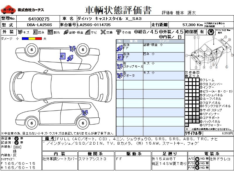 フル装備 / CD / 乗車定員(4人) / 集中ドアロック / エアバッグ / 助手席エアバッグ / ABS / トラクションコントロール / カーナビゲーション(インダッシュ,SSD,2DIN) / テレビ(アナログ) / バックカメラ / アルミホイール(社外)(15インチ) / スマートキー / フォグランプ /