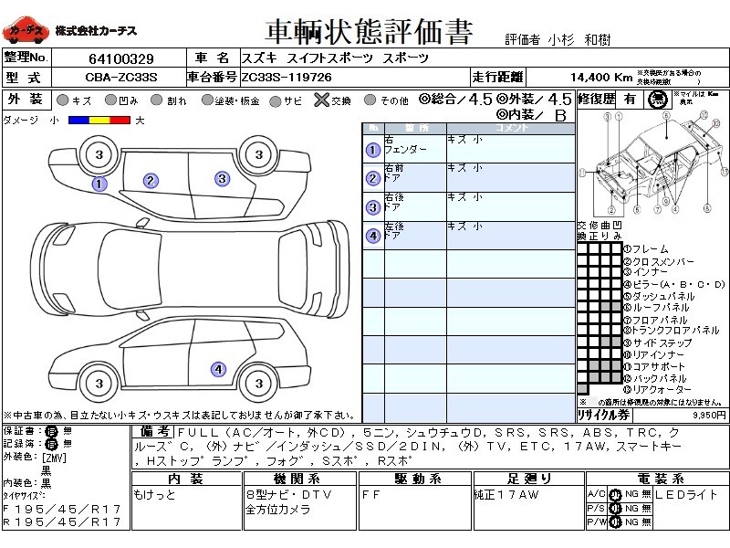 フル装備 / CD(社外) / 乗車定員(5人) / 集中ドアロック / エアバッグ / 助手席エアバッグ / ABS / トラクションコントロール / クルーズコントロール / カーナビゲーション(社外)(インダッシュ,SSD,2DIN) / テレビ(社外) / 地デジTV(社外) / ETC / アルミホイール(17インチ) / スマートキー / ハイマウントストップランプ / フォグランプ / サイドスポイラー / リアスポイラー /