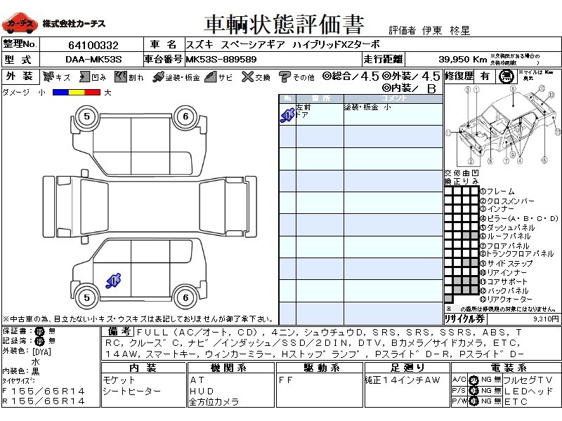 フル装備 / CD / 乗車定員(4人) / 集中ドアロック / エアバッグ / 助手席エアバッグ / サイドエアバッグ / ABS / トラクションコントロール / クルーズコントロール / カーナビゲーション(インダッシュ,SSD,2DIN) / 地デジTV / バックカメラ(サイドカメラ) / ETC / アルミホイール(14インチ) / スマートキー / ウインカーミラー / ハイマウントストップランプ / パワースライドドア / フォグランプ / サイドスポイラー /