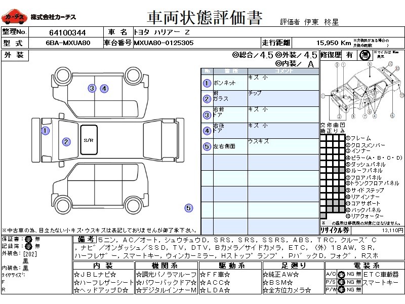 乗車定員(5人) / エアコン(オート) / パワーステアリング / パワーウィンドウ / 集中ドアロック / エアバッグ / 助手席エアバッグ / サイドエアバッグ / ABS / トラクションコントロール / クルーズコントロール / カーナビゲーション(オンダッシュ,SSD) / テレビ(アナログ) / 地デジTV / バックカメラ(サイドカメラ) / ETC / アルミホイール(社外)(18インチ) / サンルーフ / ハーフレザーシート / スマートキー / ウインカーミラー / ハイマウントストップランプ / パワーバックドア / フォグランプ / リアスポイラー /