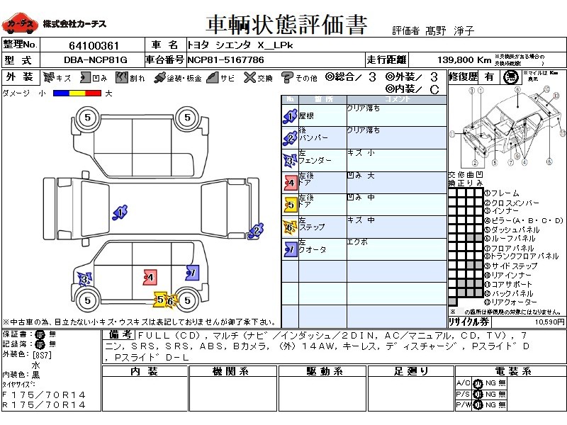 フル装備 / CD / マルチ(ナビ) / エアコン(マニュアル) / テレビ(アナログ) / 乗車定員(7人) / エアバッグ / 助手席エアバッグ / ABS / バックカメラ / ETC(社外) / アルミホイール(社外)(14インチ) / キーレスエントリー / ディスチャージ / パワースライドドア /