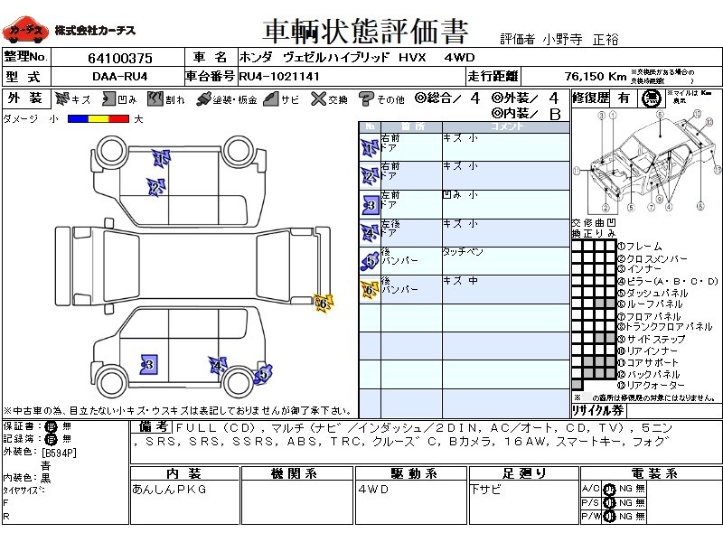 フル装備 / CD / マルチ(ナビ) / エアコン(オート) / テレビ(アナログ) / 乗車定員(5人) / エアバッグ / 助手席エアバッグ / サイドエアバッグ / ABS / トラクションコントロール / クルーズコントロール / バックカメラ / アルミホイール(16インチ) / スマートキー / フォグランプ /