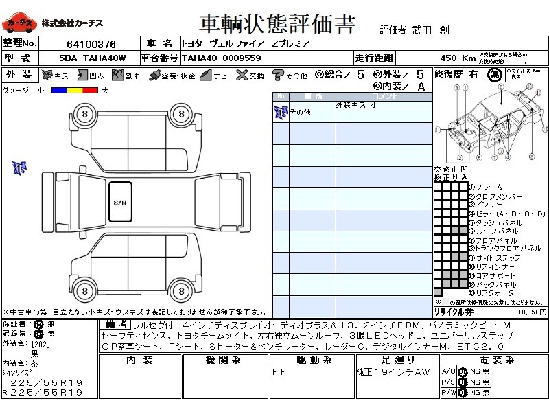 乗車定員(7人) / エアコン(オート) / パワーステアリング / パワーウィンドウ / エアバッグ / 助手席エアバッグ / サイドエアバッグ / ABS / クルーズコントロール / カーナビゲーション(SSD) / テレビ(アナログ) / 地デジTV / フリップダウンモニタ / バックカメラ / ETC / アルミホイール(19インチ) / サンルーフ / 革シート(茶) / スマートキー / ウインカーミラー / ハイマウントストップランプ / パワースライドドア / パワーバックドア / フォグランプ / リアスポイラー /
