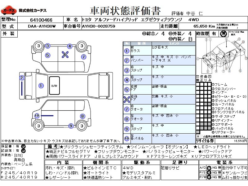 フル装備 / CD / 乗車定員(7人) / 集中ドアロック / エアバッグ / 助手席エアバッグ / サイドエアバッグ / ABS / トラクションコントロール / クルーズコントロール / カーナビゲーション(インダッシュ,SSD,2DIN) / 地デジTV / フリップダウンモニタ / バックカメラ(フロント) / ETC / アルミホイール(社外)(19インチ) / ダブルサンルーフ / 革シート(クリーム) / スマートキー / ウインカーミラー / ハイマウントストップランプ / パワースライドドア / パワーバックドア / フォグランプ / リアスポイラー /