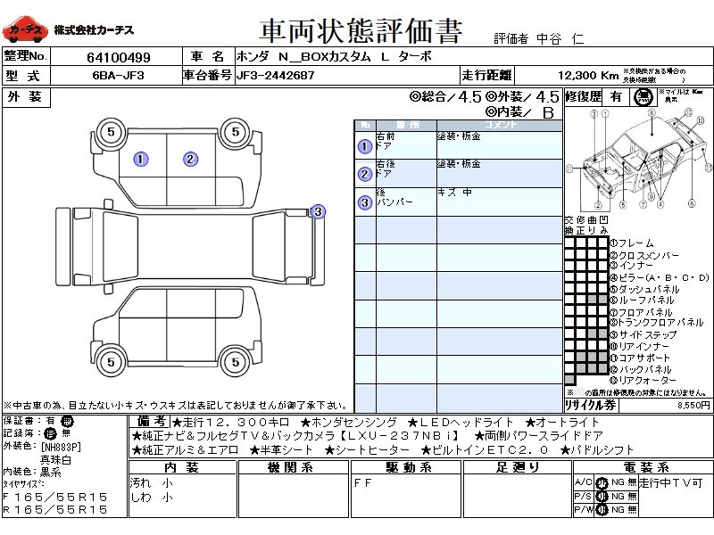 フル装備 / CD / 乗車定員(4人) / 集中ドアロック / エアバッグ / 助手席エアバッグ / サイドエアバッグ / ABS / トラクションコントロール / クルーズコントロール / カーナビゲーション(インダッシュ,SSD,2DIN) / 地デジTV / バックカメラ / ETC / アルミホイール(15インチ) / ハーフレザーシート / スマートキー / ウインカーミラー / ハイマウントストップランプ / パワースライドドア / フォグランプ / サイドスポイラー / リアスポイラー /