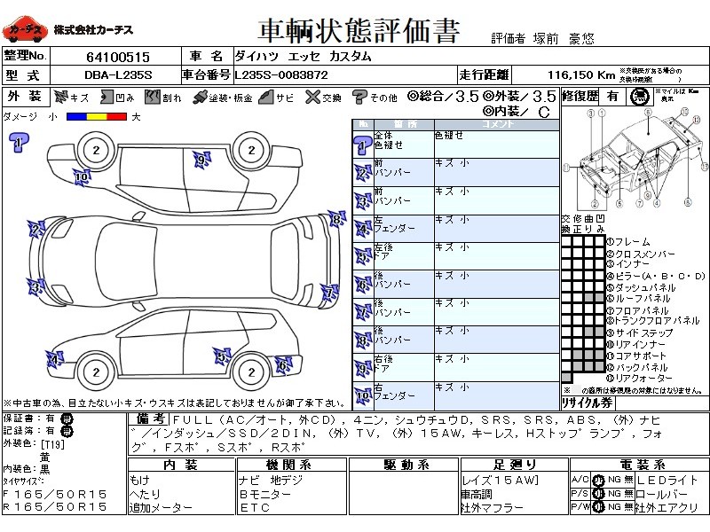 フル装備 / CD(社外) / 乗車定員(4人) / 集中ドアロック / エアバッグ / 助手席エアバッグ / ABS / カーナビゲーション(社外)(インダッシュ,SSD,2DIN) / テレビ(社外) / 地デジTV(社外) / ETC(社外) / アルミホイール(社外)(15インチ) / キーレスエントリー / ハイマウントストップランプ / フォグランプ / フロントスポイラー / サイドスポイラー / リアスポイラー / マフラー(社外) / 足回り /