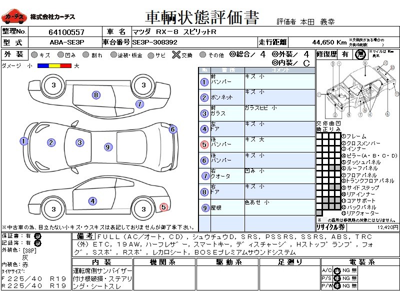 フル装備 / CD / 集中ドアロック / エアバッグ / 助手席エアバッグ / サイドエアバッグ / ABS / トラクションコントロール / ETC(社外) / アルミホイール(19インチ) / ハーフレザーシート / スマートキー / ディスチャージ / ハイマウントストップランプ / フォグランプ / サイドスポイラー / リアスポイラー /