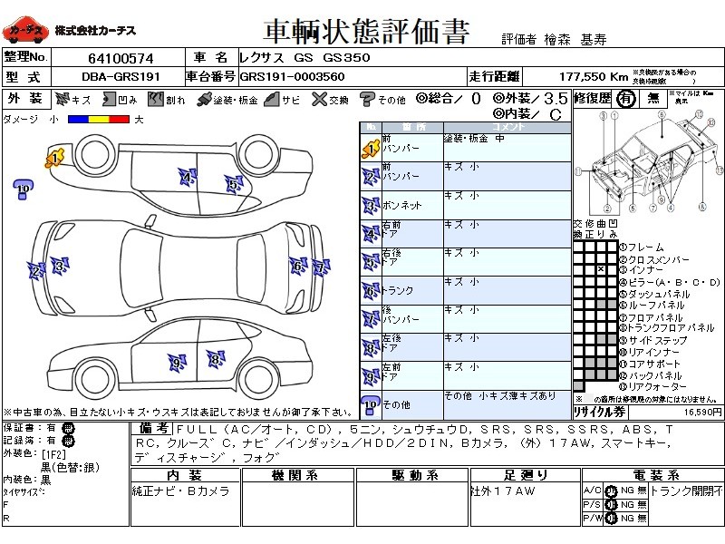 フル装備 / CD / 乗車定員(5人) / 集中ドアロック / エアバッグ / 助手席エアバッグ / サイドエアバッグ / ABS / トラクションコントロール / クルーズコントロール / カーナビゲーション(インダッシュ,HDD,2DIN) / バックカメラ / アルミホイール(社外)(17インチ) / スマートキー / ディスチャージ / フォグランプ / 足回り /