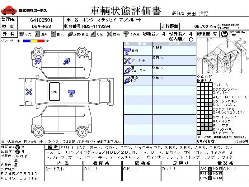 フル装備 / CD / 乗車定員(7人) / 集中ドアロック / エアバッグ / 助手席エアバッグ / ABS / トラクションコントロール / クルーズコントロール / カーナビゲーション(インダッシュ,HDD,2DIN) / テレビ(アナログ) / 地デジTV / バックカメラ(サイドカメラ) / アルミホイール(19インチ) / サンルーフ / ハーフレザーシート / スマートキー / ディスチャージ / ウインカーミラー / ハイマウントストップランプ / フォグランプ / リアスポイラー /