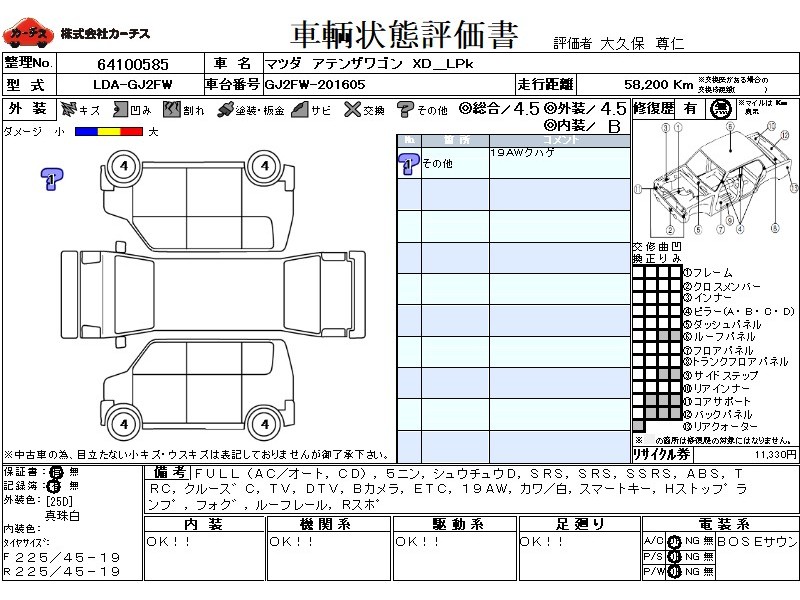 フル装備 / CD / 乗車定員(5人) / 集中ドアロック / エアバッグ / 助手席エアバッグ / サイドエアバッグ / ABS / トラクションコントロール / クルーズコントロール / テレビ(アナログ) / 地デジTV / バックカメラ / ETC / アルミホイール(19インチ) / 革シート(白) / スマートキー / ハイマウントストップランプ / フォグランプ / ルーフレール / リアスポイラー /