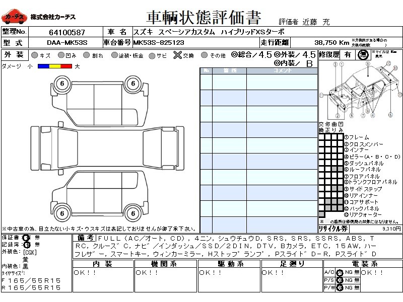 フル装備 / CD / 乗車定員(4人) / 集中ドアロック / エアバッグ / 助手席エアバッグ / サイドエアバッグ / ABS / トラクションコントロール / クルーズコントロール / カーナビゲーション(インダッシュ,SSD,2DIN) / テレビ(アナログ) / 地デジTV / バックカメラ / ETC / アルミホイール(15インチ) / ハーフレザーシート / スマートキー / ウインカーミラー / ハイマウントストップランプ / パワースライドドア / フォグランプ / サイドスポイラー / リアスポイラー /