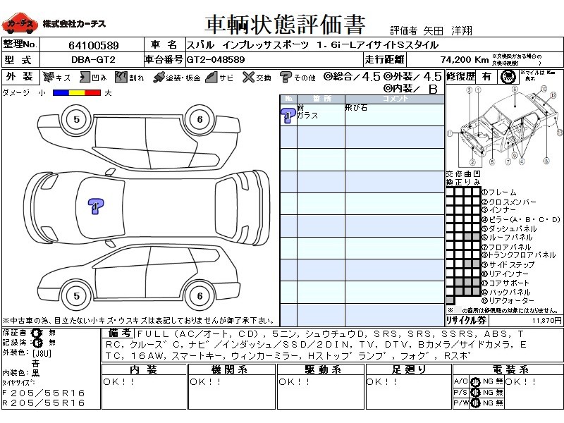 フル装備 / CD / 乗車定員(5人) / 集中ドアロック / エアバッグ / 助手席エアバッグ / サイドエアバッグ / ABS / トラクションコントロール / クルーズコントロール / カーナビゲーション(インダッシュ,SSD,2DIN) / テレビ(アナログ) / 地デジTV / バックカメラ(サイドカメラ) / ETC / アルミホイール(16インチ) / スマートキー / ウインカーミラー / ハイマウントストップランプ / フォグランプ / リアスポイラー /