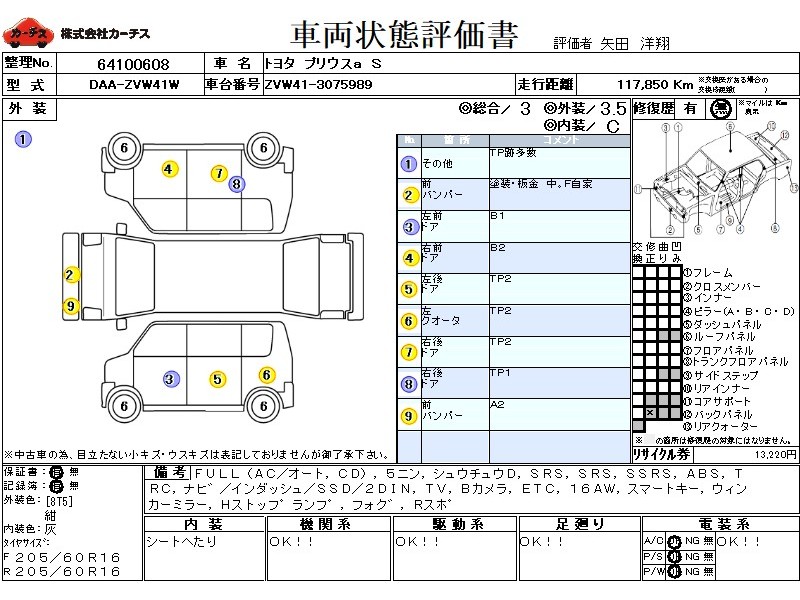 フル装備 / CD / 乗車定員(5人) / 集中ドアロック / エアバッグ / 助手席エアバッグ / サイドエアバッグ / ABS / トラクションコントロール / カーナビゲーション(インダッシュ,SSD,2DIN) / テレビ(アナログ) / バックカメラ / ETC / アルミホイール(16インチ) / スマートキー / ウインカーミラー / ハイマウントストップランプ / フォグランプ / リアスポイラー /