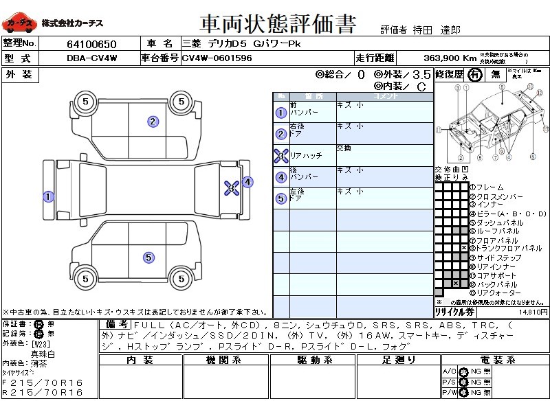 フル装備 / CD(社外) / 乗車定員(8人) / 集中ドアロック / エアバッグ / 助手席エアバッグ / ABS / トラクションコントロール / カーナビゲーション(社外)(インダッシュ,SSD,2DIN) / テレビ(社外) / ETC(社外) / アルミホイール(社外)(16インチ) / スマートキー / ディスチャージ / ハイマウントストップランプ / パワースライドドア / フォグランプ /