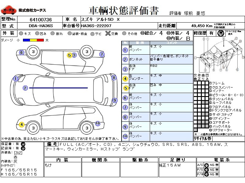 フル装備 / CD / 乗車定員(4人) / 集中ドアロック / エアバッグ / 助手席エアバッグ / ABS / アルミホイール(15インチ) / スマートキー / ウインカーミラー / ハイマウントストップランプ /