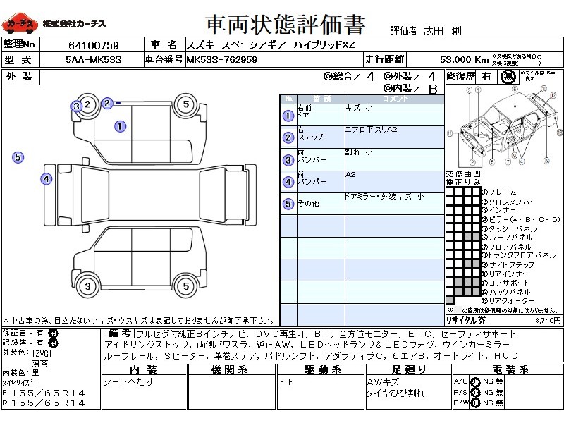 フル装備 / CD / 乗車定員(4人) / エアバッグ / 助手席エアバッグ / サイドエアバッグ / ABS / トラクションコントロール / クルーズコントロール / カーナビゲーション(SSD) / テレビ(アナログ) / 地デジTV / バックカメラ / ETC / アルミホイール(14インチ) / スマートキー / ウインカーミラー / ハイマウントストップランプ / パワースライドドア / フォグランプ / ルーフレール / サイドスポイラー /