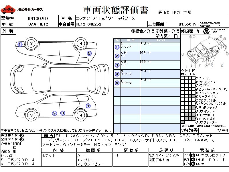 フル装備 / CD / 乗車定員(5人) / 集中ドアロック / エアバッグ / 助手席エアバッグ / ABS / トラクションコントロール / カーナビゲーション(インダッシュ,SSD,2DIN) / テレビ(アナログ) / 地デジTV / バックカメラ(サイドカメラ) / ETC / アルミホイール(社外)(14インチ) / スマートキー / ウインカーミラー / ハイマウントストップランプ /