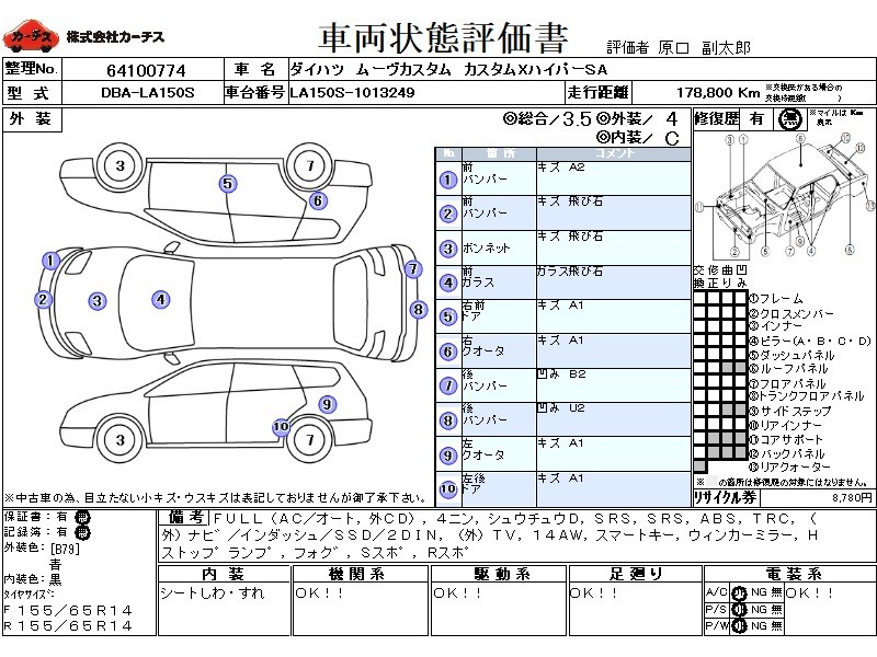 フル装備 / CD(社外) / 乗車定員(4人) / 集中ドアロック / エアバッグ / 助手席エアバッグ / ABS / トラクションコントロール / カーナビゲーション(社外)(インダッシュ,SSD,2DIN) / テレビ(社外) / 地デジTV(社外) / ETC(社外) / アルミホイール(14インチ) / スマートキー / ウインカーミラー / ハイマウントストップランプ / フォグランプ / サイドスポイラー / リアスポイラー /