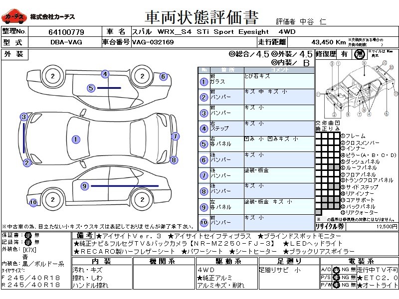 アイサイト3!アイサイトセイフティプラス!ブラインドスポットモニター!純正ナビ&フルセグTV&DVD&BT&バックカメラ!RECARO製半革シート!LEDヘッドライト!オートライト!純正アルミ!ETC2.0!