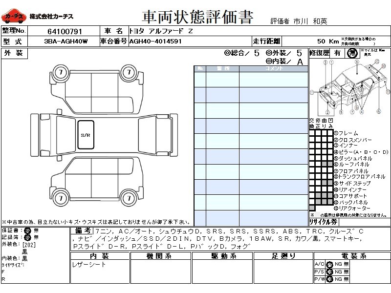 乗車定員(7人) / エアコン(オート) / パワーステアリング / パワーウィンドウ / 集中ドアロック / エアバッグ / 助手席エアバッグ / サイドエアバッグ / ABS / トラクションコントロール / クルーズコントロール / カーナビゲーション(インダッシュ,SSD,2DIN) / 地デジTV / バックカメラ / アルミホイール(18インチ) / サンルーフ / 革シート(黒) / スマートキー / パワースライドドア / パワーバックドア / フォグランプ /