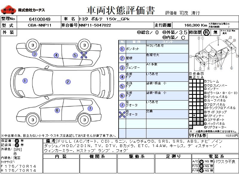フル装備 / CD / 乗車定員(5人) / 集中ドアロック / エアバッグ / 助手席エアバッグ / ABS / カーナビゲーション(インダッシュ,HDD,2DIN) / テレビ(アナログ) / 地デジTV / バックカメラ / ETC / アルミホイール(14インチ) / キーレスエントリー / ディスチャージ / ウインカーミラー / ハイマウントストップランプ / フォグランプ /