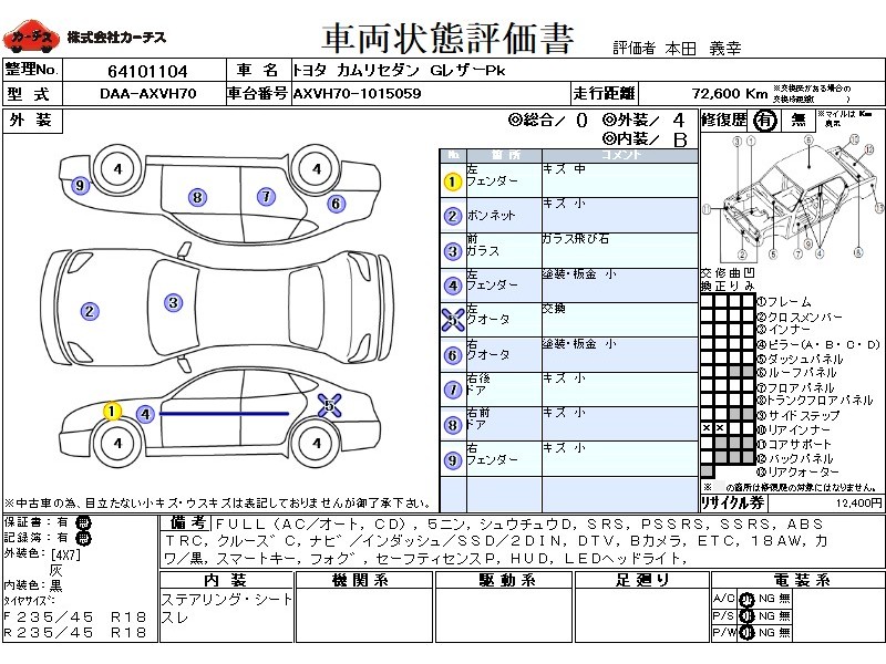 フル装備 / CD / 乗車定員(5人) / 集中ドアロック / エアバッグ / 助手席エアバッグ / サイドエアバッグ / ABS / トラクションコントロール / クルーズコントロール / カーナビゲーション(インダッシュ,SSD,2DIN) / 地デジTV / バックカメラ / ETC / アルミホイール(18インチ) / 革シート(黒) / スマートキー / フォグランプ /