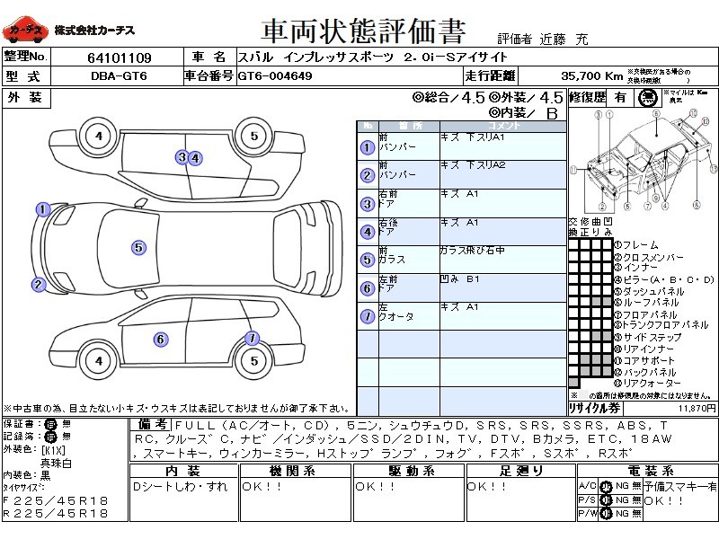 フル装備 / CD / 乗車定員(5人) / 集中ドアロック / エアバッグ / 助手席エアバッグ / サイドエアバッグ / ABS / トラクションコントロール / クルーズコントロール / カーナビゲーション(インダッシュ,SSD,2DIN) / テレビ(アナログ) / 地デジTV / バックカメラ / ETC / アルミホイール(18インチ) / スマートキー / ウインカーミラー / ハイマウントストップランプ / フォグランプ / フロントスポイラー / サイドスポイラー / リアスポイラー /